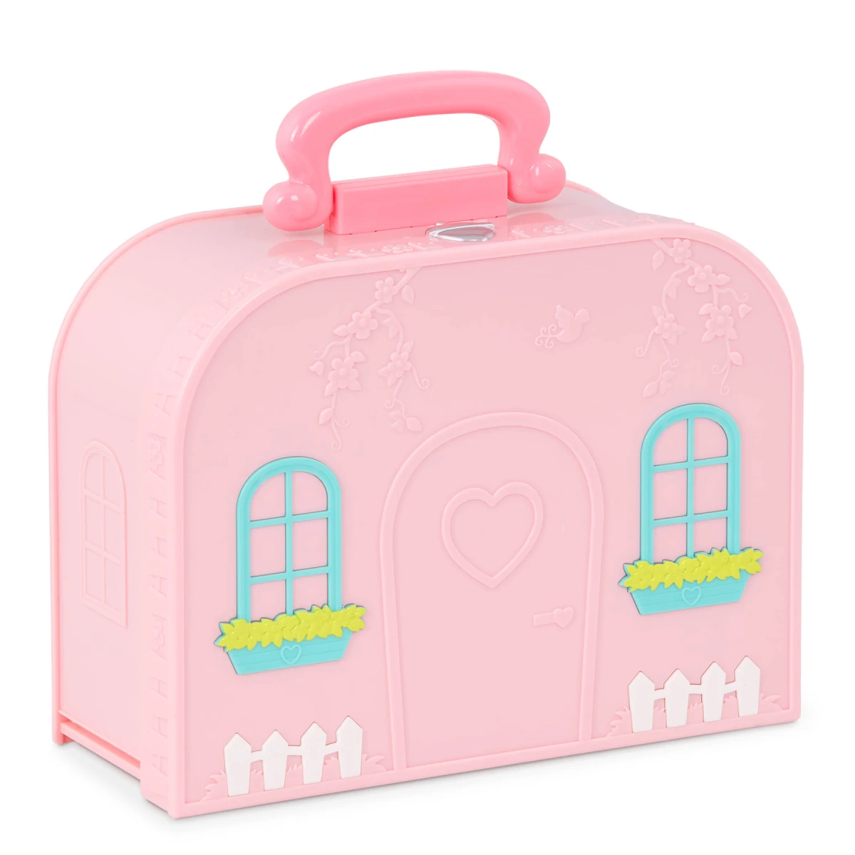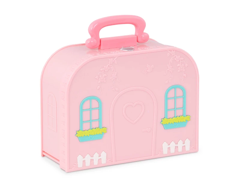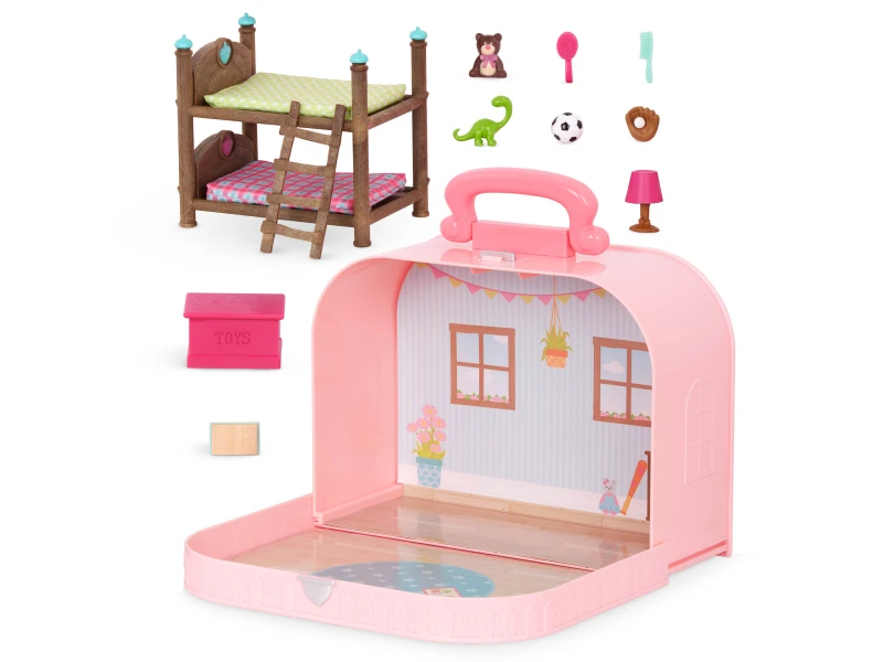 16-dílná sada obsahuje kufřík, 2 postavičky zvířátek, palandu, 2 matrace, žebřík, box na hračky, fotbalový míč, medvídka, 1 míč a rukavice, knihu, lampu, dinosaura, kartáč a hřeben.