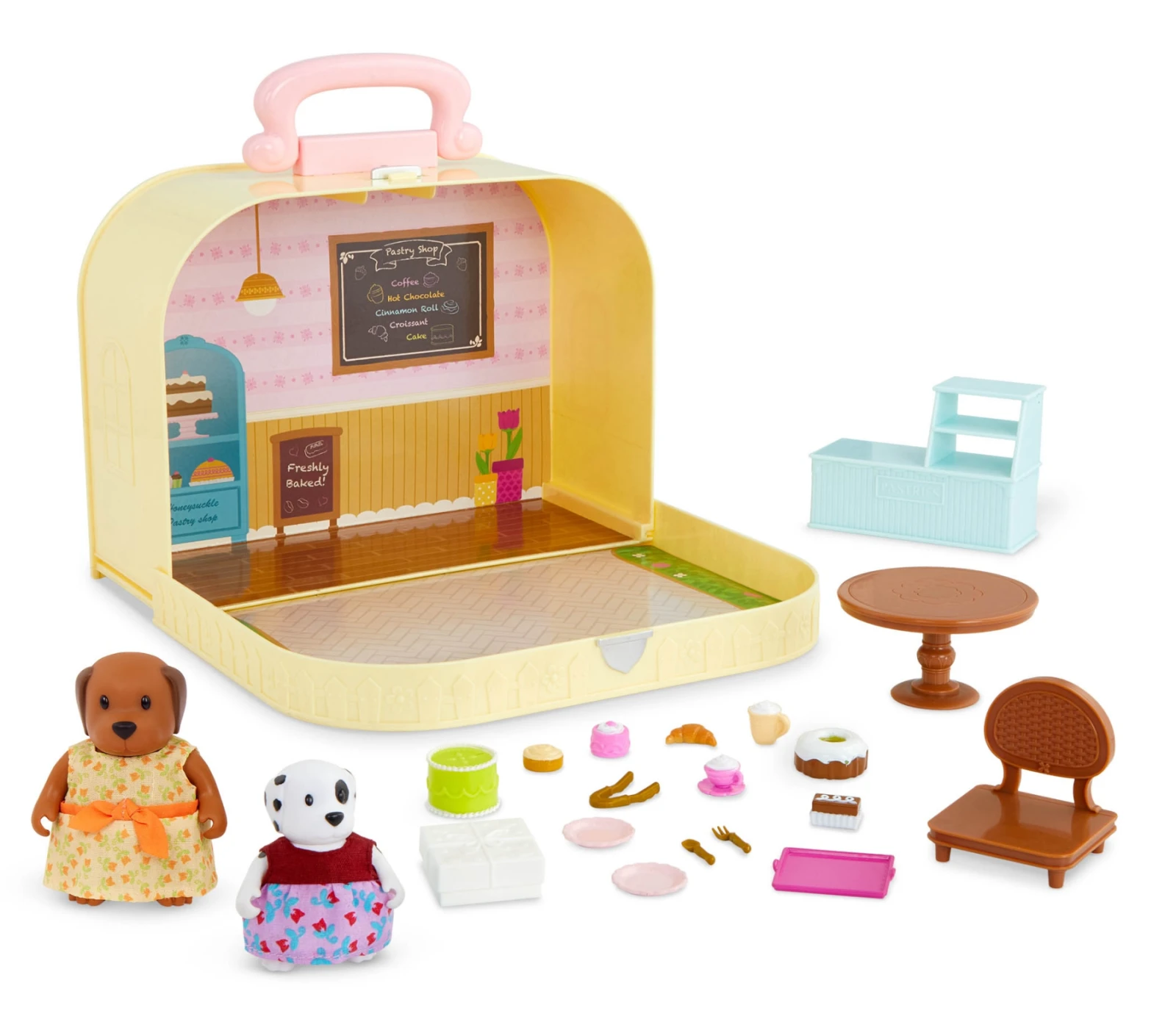 22-dílná sada obsahuje kufřík, 2 postavičky pejsků, pult, stůl, židli, krabičku, horkou čokoládu, vysoký dort, dort, 1 skořicovou rolku, croissant, čokoládový dort, tác, 2 talíře, vidličku, lžíci, kleště, cappuccino, podšálek, malý jahodový dort.