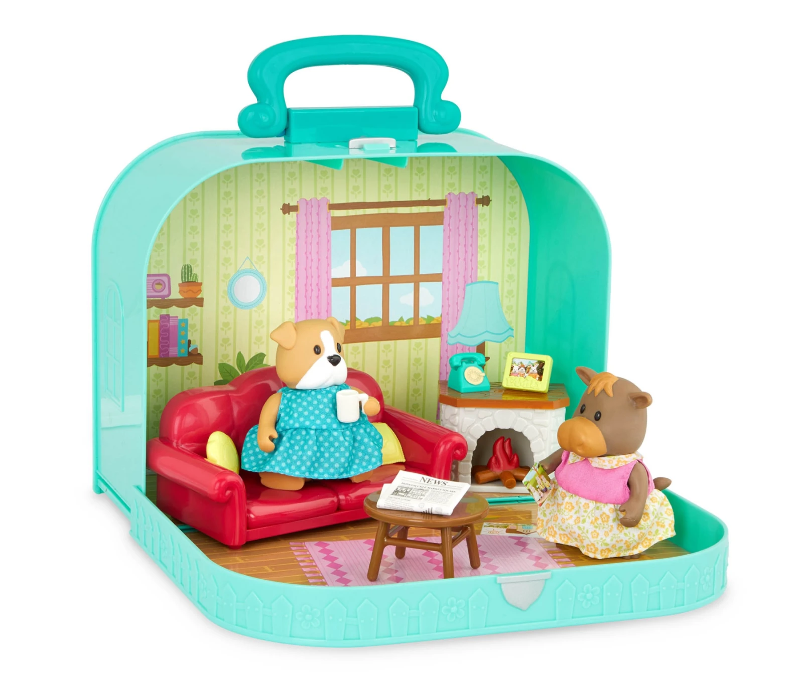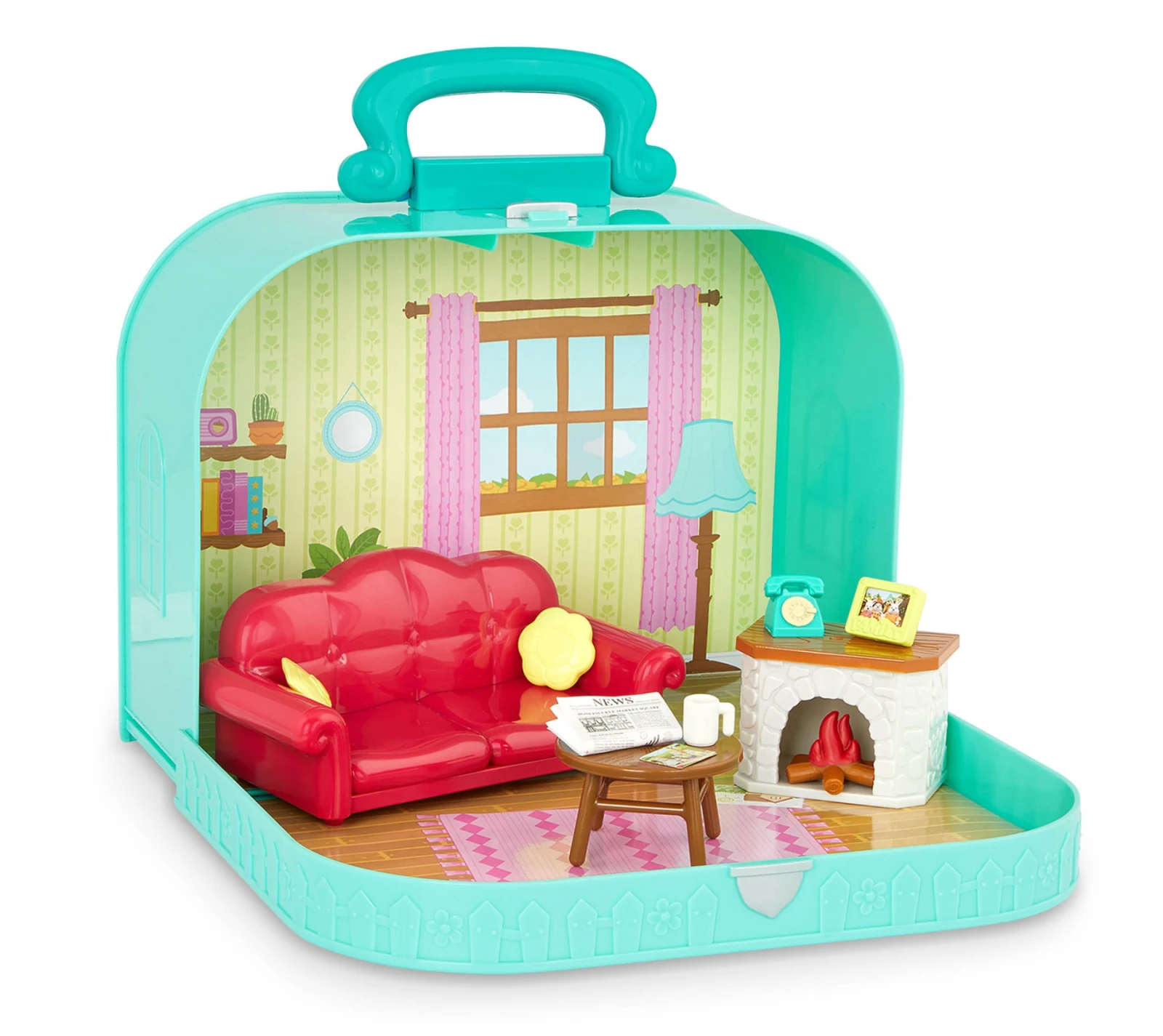 15-dílná sada obsahuje kufřík, 2 postavičky zvířátek, pohovku, 2 polštáře, rámeček, 2 fotografie, noviny, krb, oheň, konferenční stolek, telefon a hrnek.