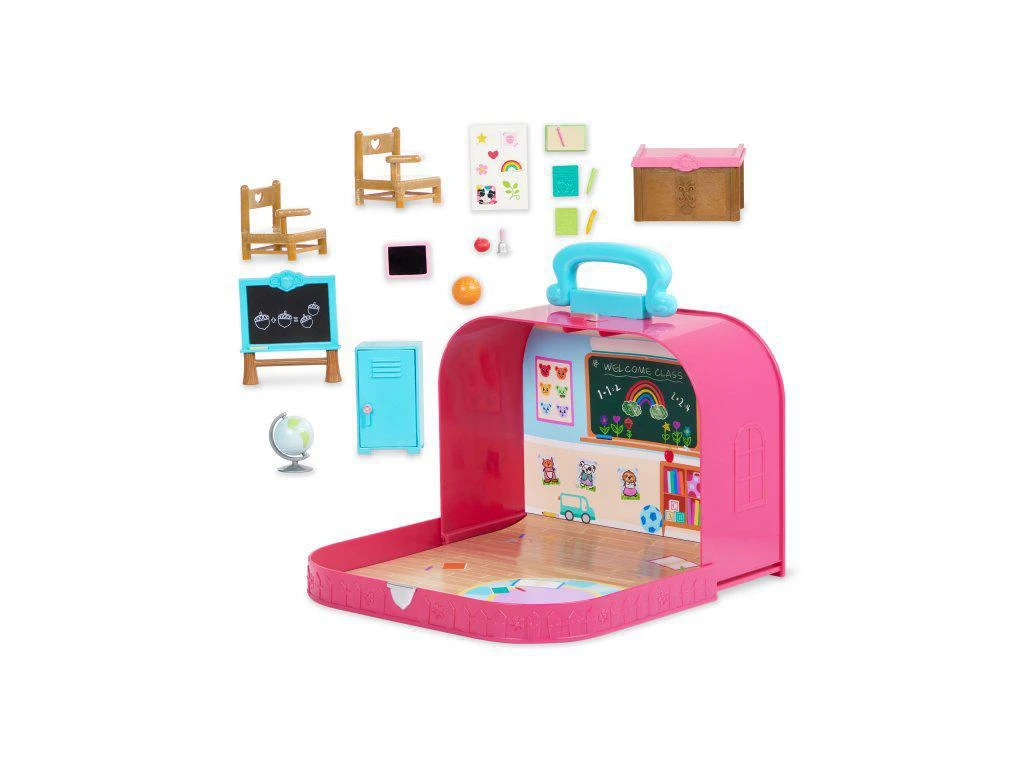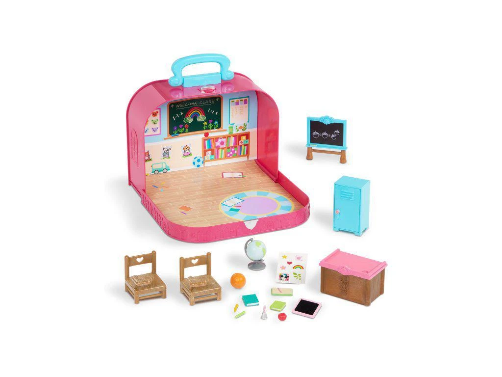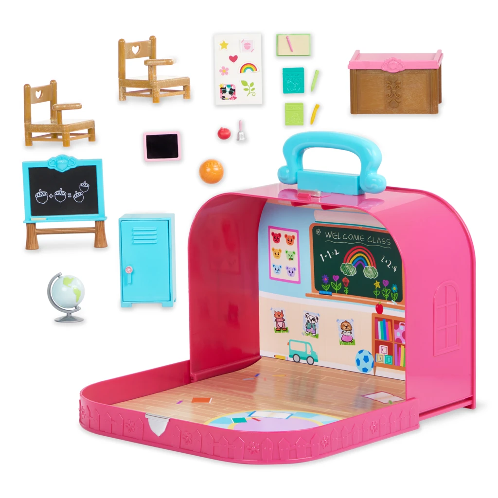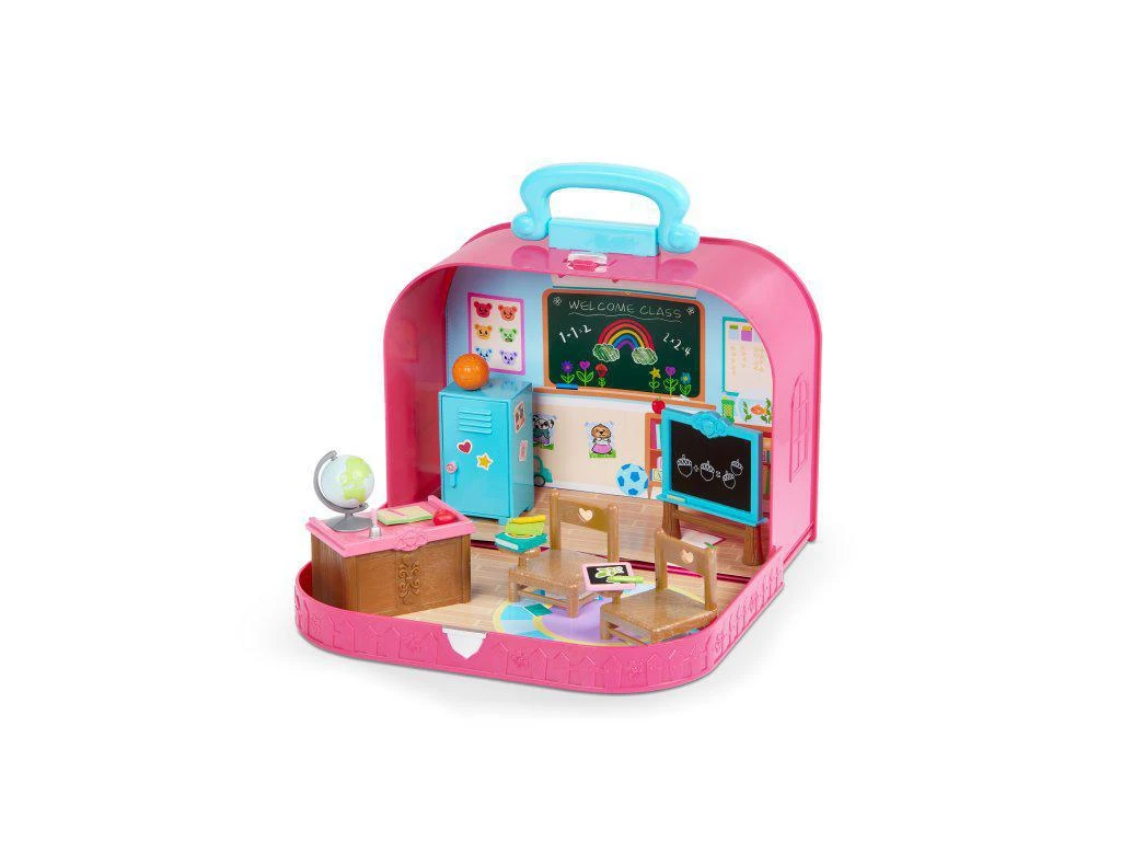 17-dílná sada obsahuje kufřík, tabuli, skříňku, dvě židle, stůl, globus, míč, knihy, sešit, psací potřeby, zvonek, jablko, tabulku a samolepky.
