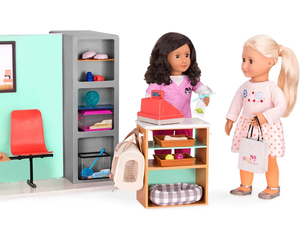 Výrobek obsahuje: 1 pult, 1 pokladnu, 2 proutěné košíky, 2 misky pro domácí mazlíčky, 1 akvárium, 1 síťku na rybičky, 1 rybičku, 1 rybičku v sáčku, 1 klec na křečka s běhacím kolečkem, 1 nákupní tašku, 2 hračky pro zvířátka, 1 míček na hraní pro zvířátka, 1 míček na hraní pro kočičky, 1 kost na hraní, 1 přenosnou tašku na domácí mazlíčky, 1 pelíšek pro psy.