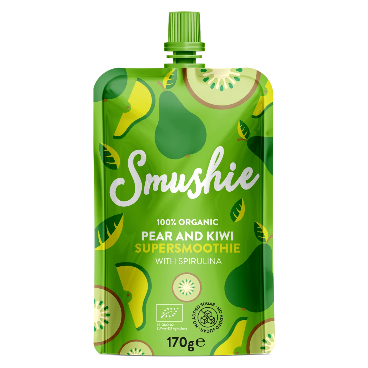 Složení: *hruškové pyré 65 %, *kiwi pyré 20 %, *banánové pyré, *ovesné vločky, *máta, *spirulina 0,04 %. *z ekologického zemědělství.