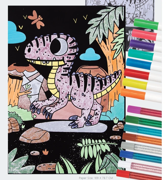 Kreativní sada obsahuje jednu velkou sametovou omalovánku o velikosti 57 × 35 cm, 8 smývatelných fixů a 8 třpytivých gelů v tubě.