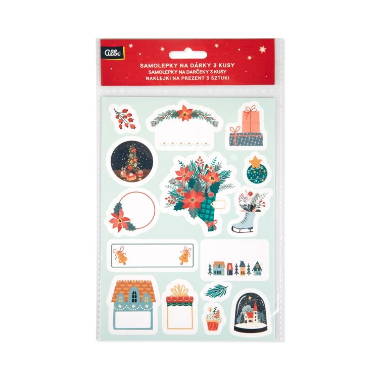 Sada 3 archů mintových tvarovaných samolepek na vánoční dárky, které poslouží jako jmenovky či ozdoby. Rozměry archů: 14,8 × 21 cm.