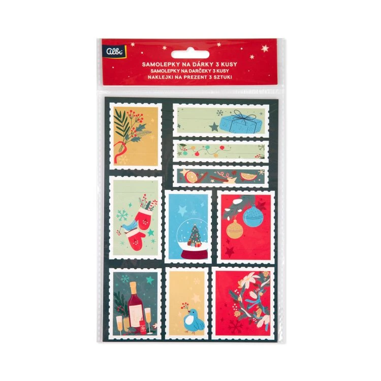 Sada 3 archů samolepek na dárky ve tvaru poštovních známek, které poslouží jako jmenovky či ozdoby.