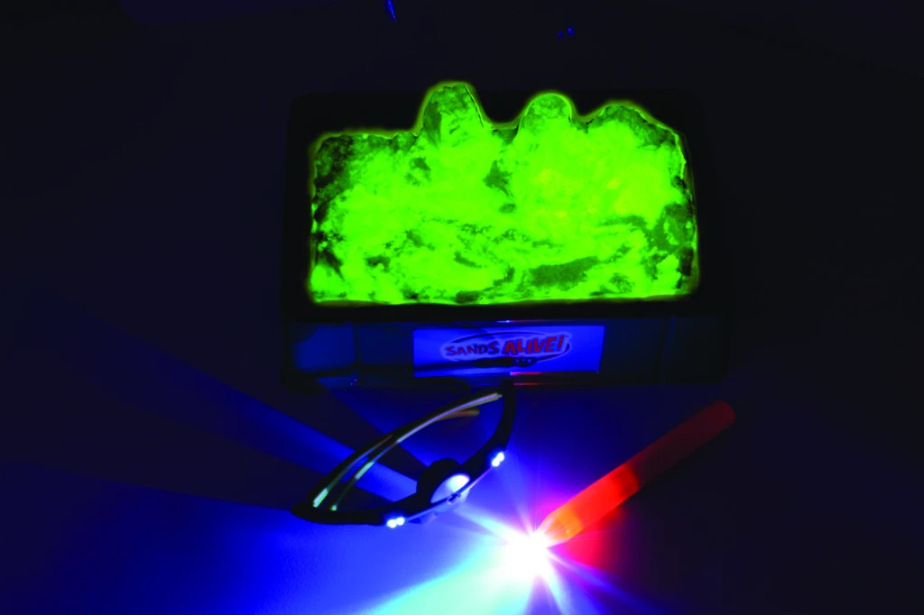 Sada obsahuje „brýle“ se světýlkem, pero se světýlkem, hrací podnos a písek.