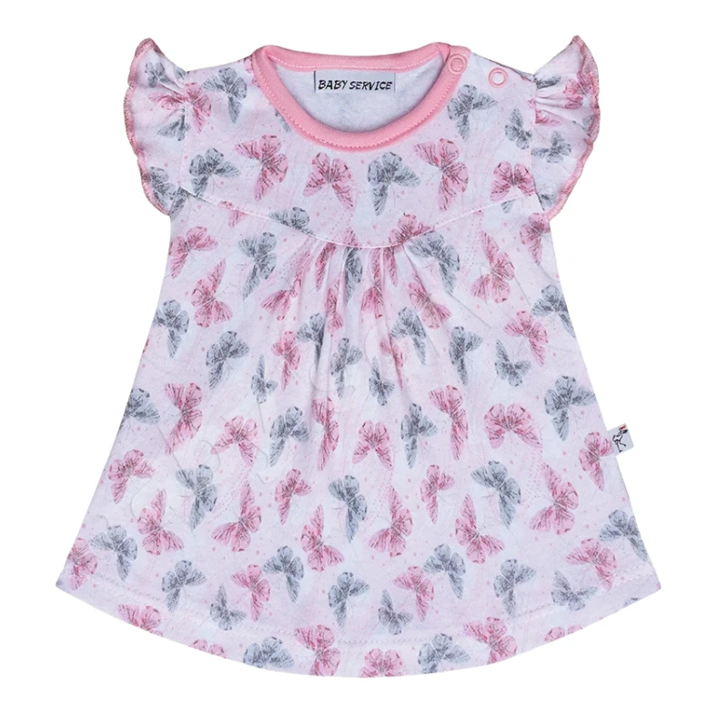 Roztomilé dětské šatičky s krátkým rukávem od české značky Baby Service si zamilujete na první pohled. Jsou ušité z příjemné 100% bavlny, která je ideální i pro citlivou dětskou pokožku. Jemný potisk barevných motýlků působí hravě a něžně zároveň – perfektní volba pro každodenní nošení i speciální příležitosti.