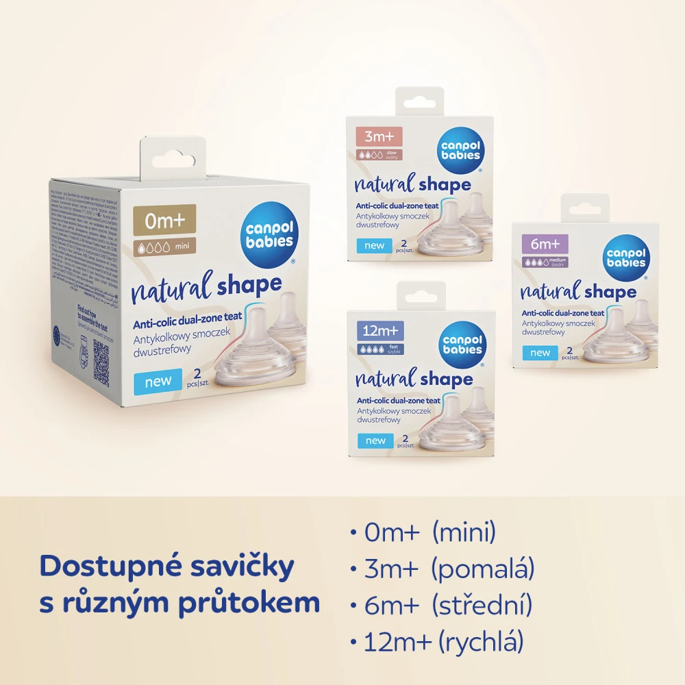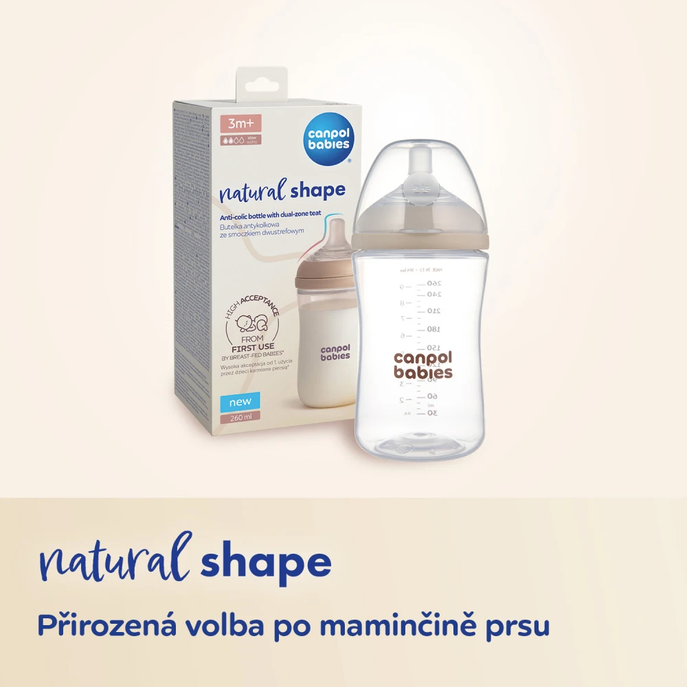 Speciální dvouzónová savička Natural Shape je přirozenou volbou po kojení z prsu. Byla navržena ve spolupráci s neurologopedkou, aby vyhovovala potřebám rodičů, kteří střídají kojení a krmení z lahve, nebo výlučně kojí odsátým mlékem (používají lahev). Jednou z největších obav rodičů je odmítání kojení během krmení z lahve. Logopedická studie Natural Shape s dvouzónovou savičkou u kojenců* ukázala, že ji kojené děti rychle přijímají již od prvního krmení. Savička snižuje riziko odmítnutí kojení a podporuje střídavé krmení***.