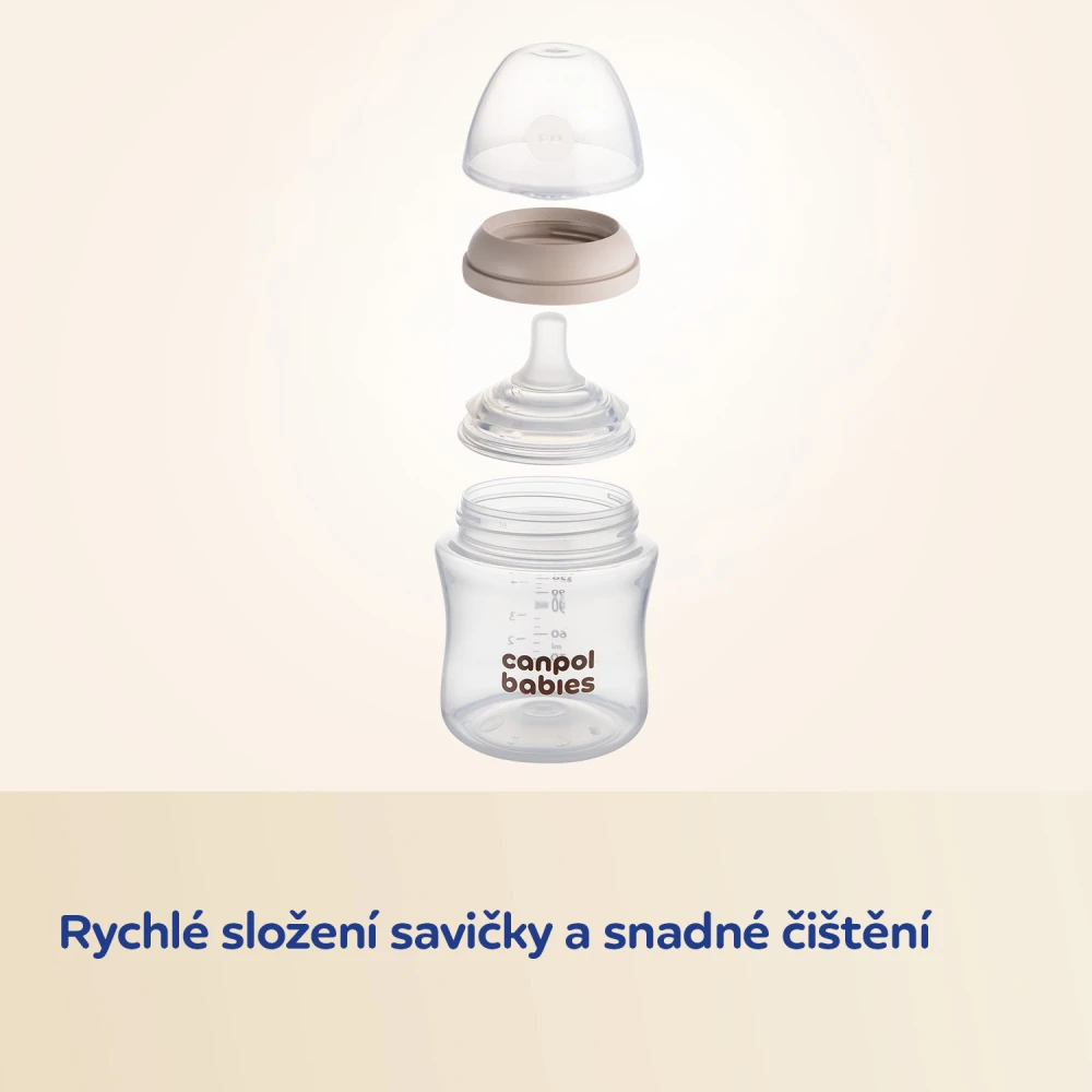 Je vyrobena z vysoce kvalitního silikonu bez BPA, jehož tvar a textura napodobují matčinu bradavku. Je lehká, praktická a snadno se čistí – doporučujeme používat ekologický čistič lahví a saviček Canpol babies (katalogové číslo: 1/500).