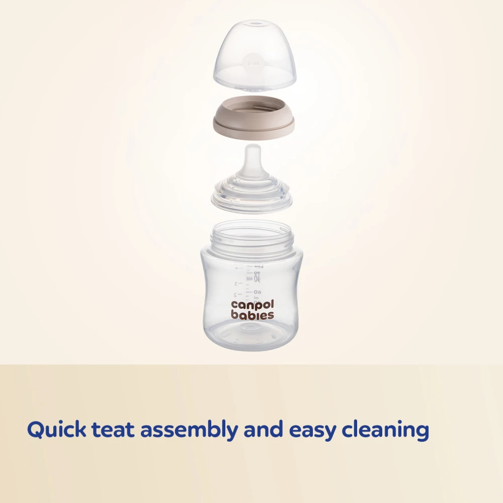 Je vyrobena z vysoce kvalitního silikonu bez BPA, jehož tvar a textura napodobují matčinu bradavku. Je lehká, praktická a snadno se čistí – doporučujeme používat ekologický čistič lahví a saviček Canpol babies (katalogové číslo: 1/500).