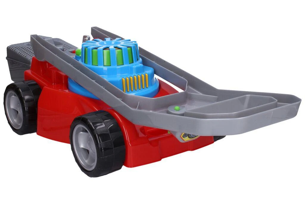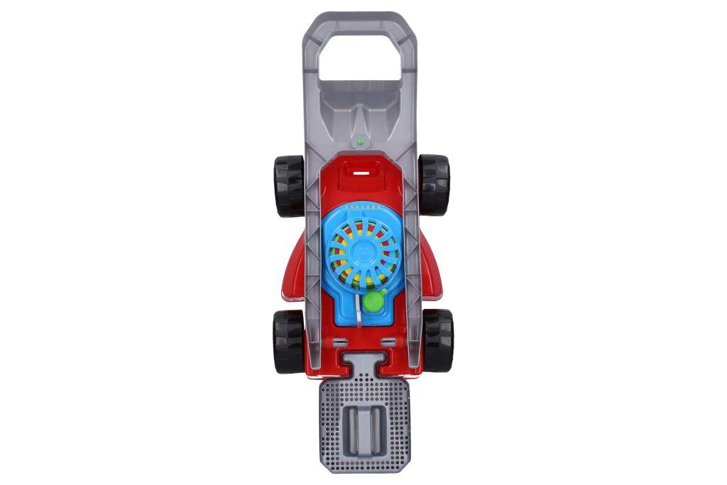 Přední kolečka jsou volná, zadní kolečka při jízdě cvakají. V rukojeti je cvakající otočný spínač. Uprostřed sekačky je barevná rotující spirála, která se roztáčí vytažením, nebo zasunutím páčky.