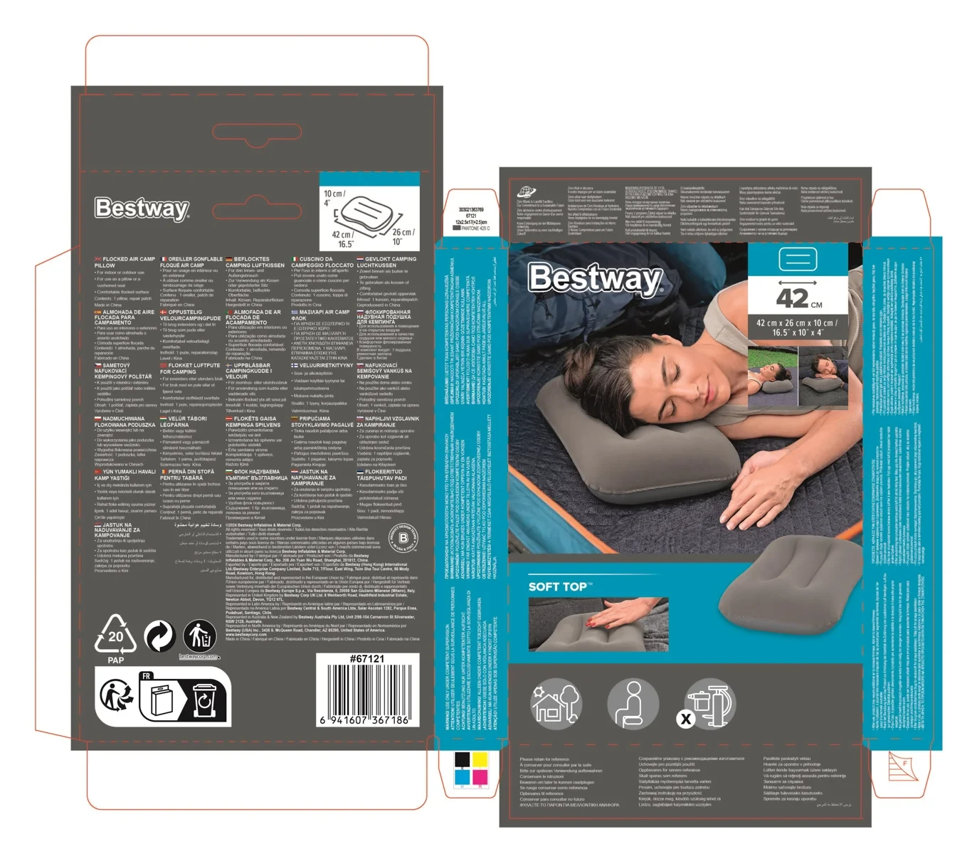 Pohodlí na cestách i doma! Nafukovací polštář Bestway s jemným semišovým povrchem je ideálním společníkem na cestování, kempování i relaxaci. Poskytne vám pohodlnou oporu hlavy, ale skvěle poslouží i jako podložka k sezení.