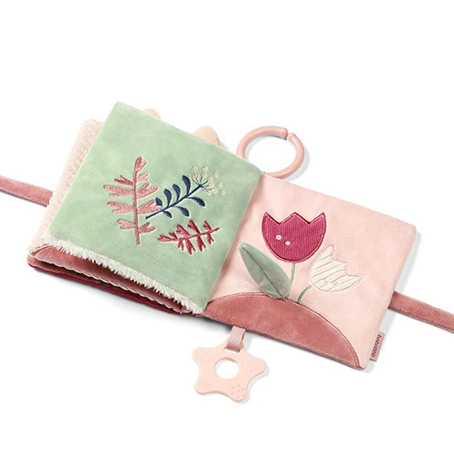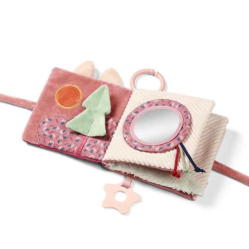 Jednotlivé stránky ukrývají šusticí prvky vydávající zajímavé zvuky, jemnou chrastítkovou výplň podporující třepání, bezpečné zrcátko pro objevování vlastního odrazu, barevné stužky a uzlíky k uchopování i kousátko masírující dásně.