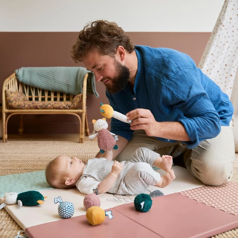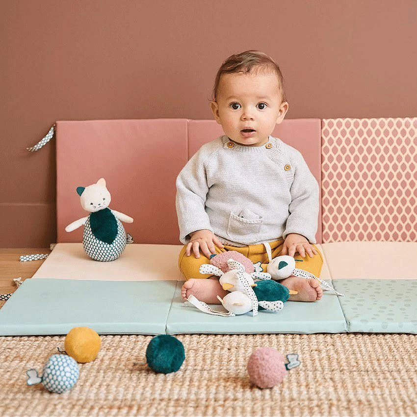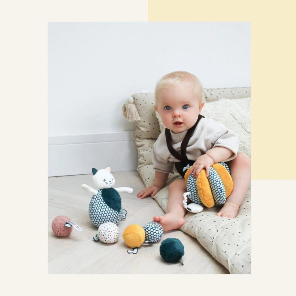 - Míčky mají kontrastní barvy a vzory speciálně navrženy tak, aby rozvíjely zrak dítěte.