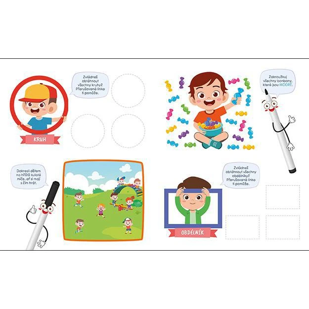 Titul obsahuje 20 stíratelných stran s úkoly pro trénování předškolních dovedností. Fix je součástíbalení.