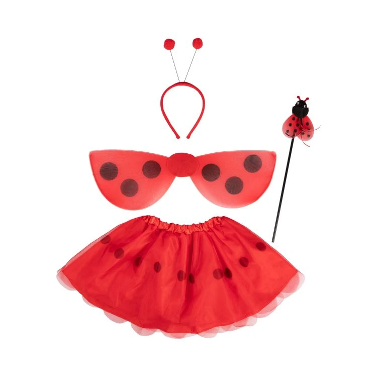 Tento dětský set je laděný do červené a černé barvy a obsahuje čelenku s tykadly, hůlku s beruškou, křídla a tylovou sukni s potiskem puntíků.