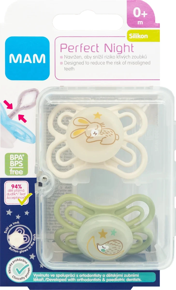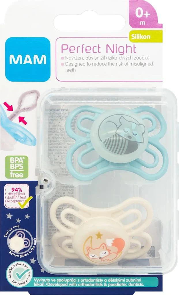 Šidítko Perfect Night silikon 0m+ se sterilizačním boxem MAM