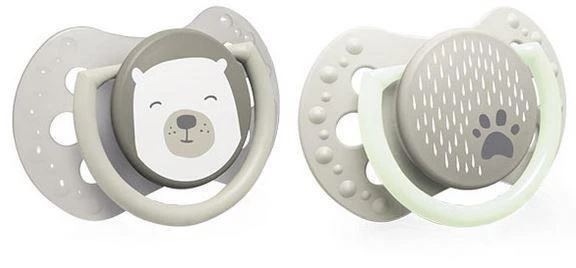 3) Dynamická gumička je vyrobena z nestejnorodých vrstev silikonu, takže se prodlužuje a smršťuje v závislosti na rytmu sání dítěte. Symetrický tvar připomíná matčinu bradavku. Tvar gumičky také umožňuje vložení šidítka do úst dítěte libovolným způsobem (nemá určenu vrchní a spodní stranu).