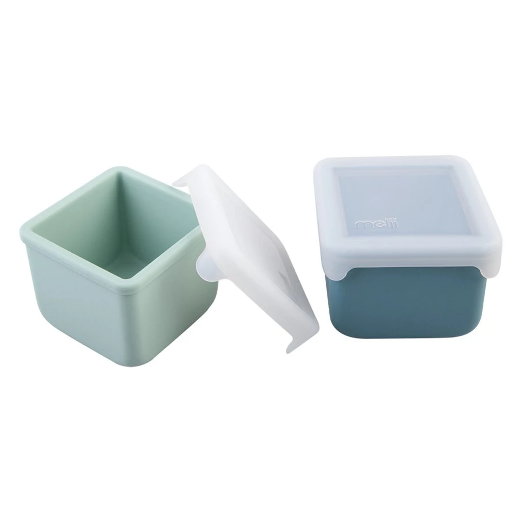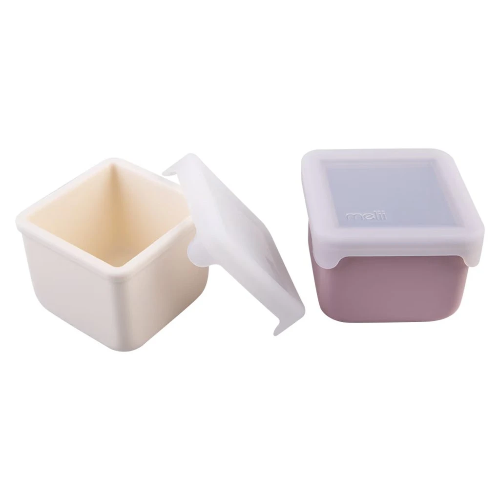 Sada dvou silikonových snack boxů Melii. Praktické, lehké, odolné a snadno se otevírají – ideální pro každodenní svačiny doma, ve škole i na cestách.