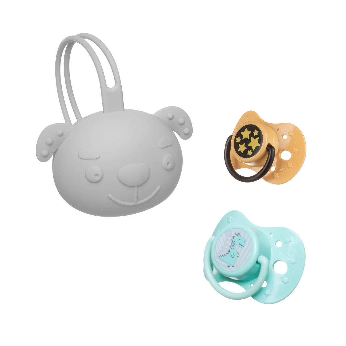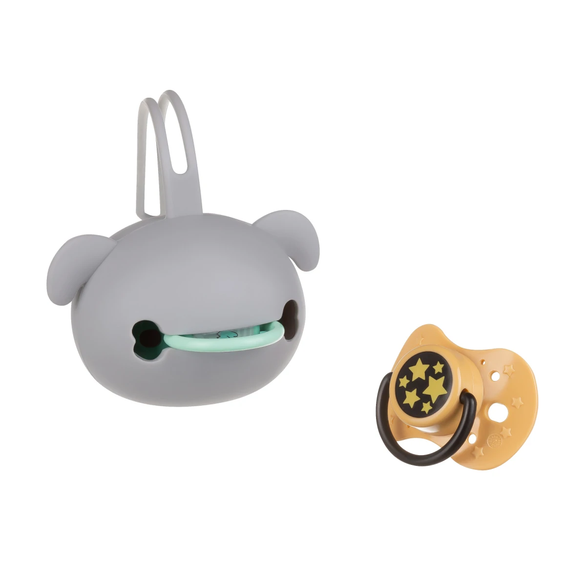 Praktický box na dudlíky ve tvaru psí hlavičky zajistí bezpečné a hygienické uložení dudlíků doma i na cestách. Díky kompaktní velikosti se snadno vejde do kabelky, batohu nebo kapsy a speciální silikonové poutko umožňuje upevnění na kočárek, postýlku či autosedačku.