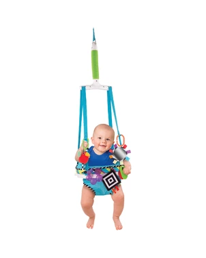 systému, lze připevnit na různé druhy dveřních rámů. Úchytný systém zajišťuje bezpečnost miminka sedícího v něm. Skákadlo je možné nastavit do různé výšky pro batolata od 4 měsíců, až do věku kdy děti začínají chodit. Textilní sedátko lze jednoduše vyndat a vyprat v pračce. Skákadlo obsahuje pět vyměnitelných hraček, které se mohou vyměnit s hračkami z kolekce Sassy připojitelných hraček. Nosnost 12 kg
