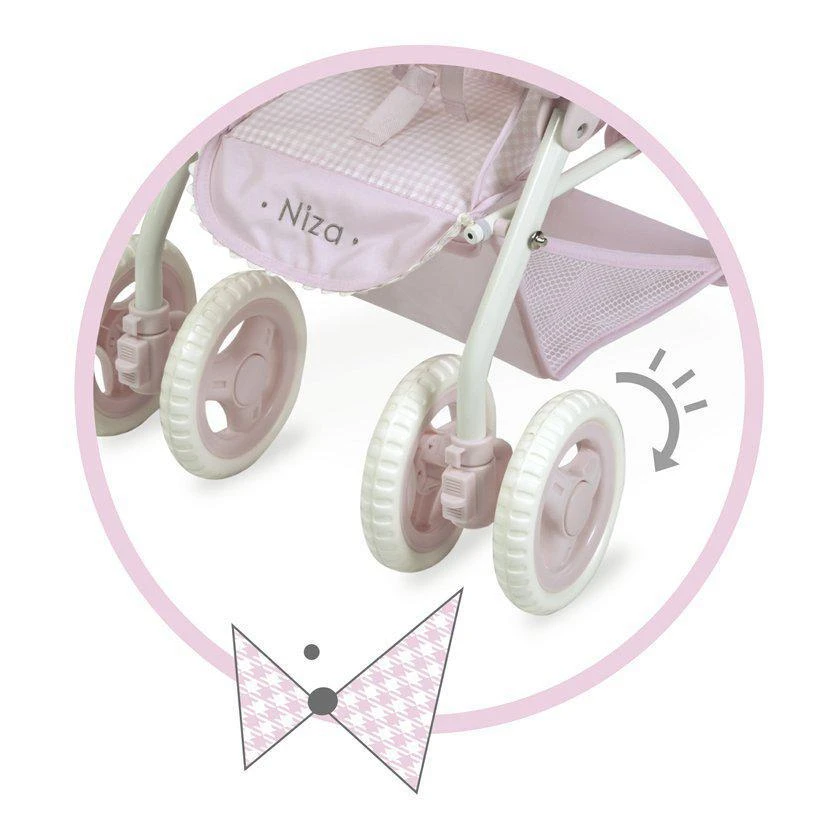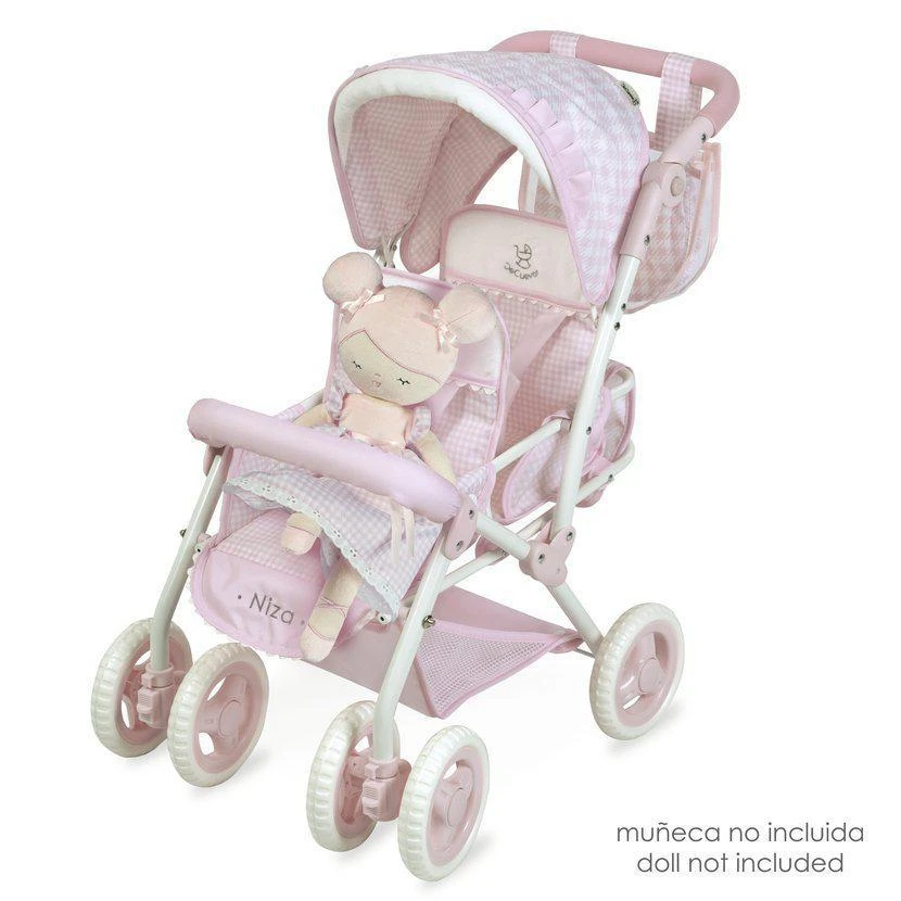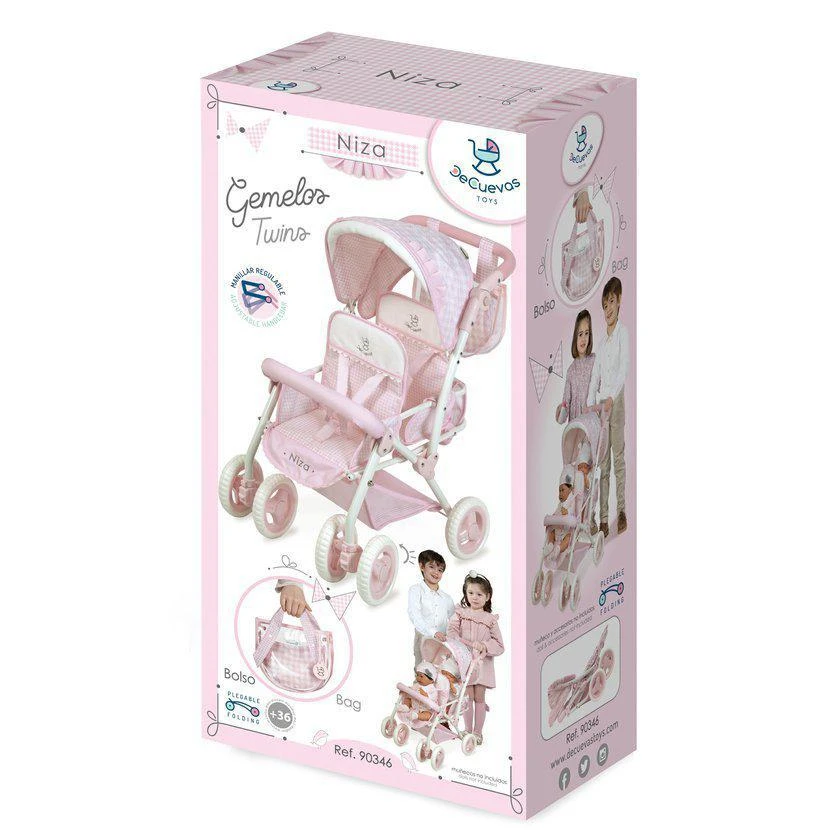 DeCuevas 90346 Skládací kočárek pro dvojčata panenky s taškou NIZA 2022 - 72 cm, ze stejnojmenné něžně růžové kolekce NIZA, která je novinkou roku 2022 je díky polohovatelné rukojeti a své konstrukci spíš vhodný pro slečny předškolního věku, ale i větší slečny. Kolekce NIZA nabízí krom různých druhů kočárků i nábytek pro panenky a malé parádnice. Nádherný španělský design, precizní zpracování. Skládací model, velmi snadná manipulace během samotné hry. Materiál: kov, plast, textil. Baleno v krabici v barvách kolekce. Doporučený věk od 3 let.
