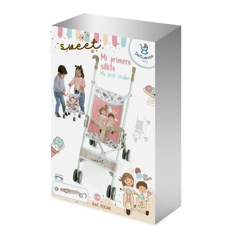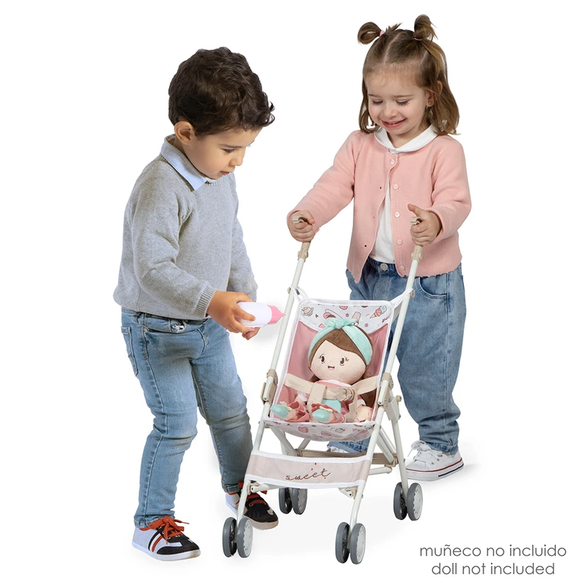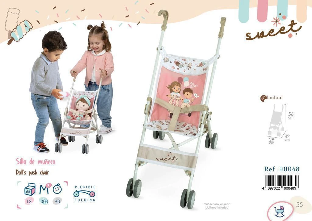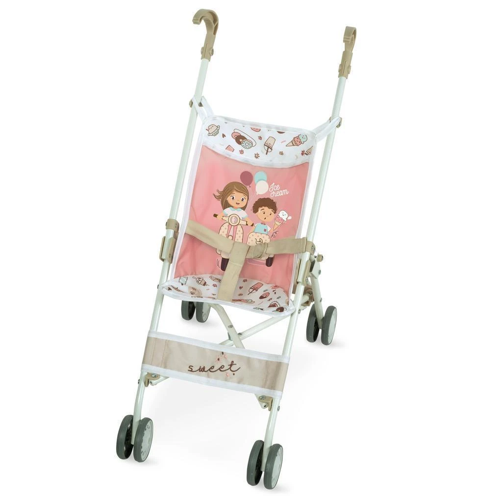DeCuevas 90048 Skládací kočárek pro panenky golfové hole SWEET 2022 - 56 cm, ze stejnojmenné veselé kolekce, která je novinkou roku 2022, je díky nízké rukojeti vhodný především pro malé slečny. Kolekci SWEET vévodí roztomilé postavičky děvčátka a chlapce jedoucích na motorce se sajdkárou, za nimiž vlají barevné nafukovací balónky. Sladěná kombinace barev lososové s béžovou a bílé s jemnými motivy drobných dortíků, zmrzlinek a muffinů působí roztomile. Nádherný španělský design, precizní zpracování. Skládací model, velmi snadná manipulace během samotné hry. Materiál: kov, plast, textil. Baleno v designovém igelitovém obalu v barvách kolekce. Doporučený věk od 3 let.