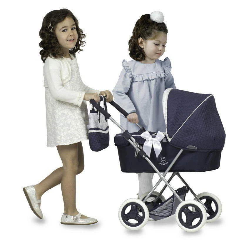DeCuevas 85044 Skládací kočárek pro panenky se slunečníkem a doplňky VINTAGE 2022 - 60 cm, ze stejnojmenné kolekce, která je novinkou roku 2022, je díky nízké rukojeti a lehké váze vhodný pro menší slečny. Tato decentní stylová kolekce v kombinaci jen dvou barev, nerušená jiným barevným efektem. Jedná se o tmavě modrou a ledově bílou s jemným modrým potiskem. Jednoduché ozdoby ve tvaru bílých mašlí a úzké zdobné lemy s malými zoubky, působí čistě. Do celého stylu vintáž perfektně zapadají i madla kočárků, vyrobená v imitaci dřeva, či kůže, což v dnešní době vídáme často i na reálných dětských kočárcích. Nádherný španělský design, precizní zpracování. Skládací model, velmi snadná manipulace během samotné hry. Materiál: kov, plast, textil. Baleno v krabici v barvách kolekce. Doporučený věk od 3 let.