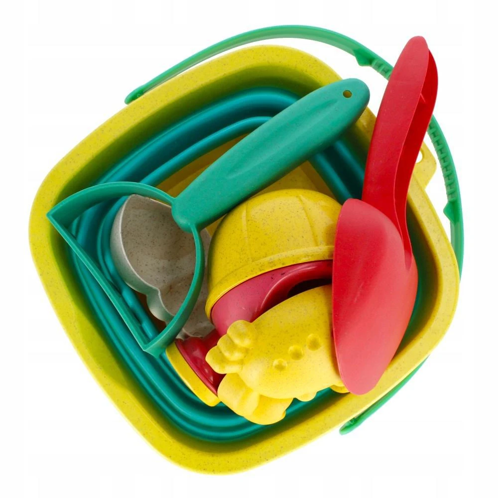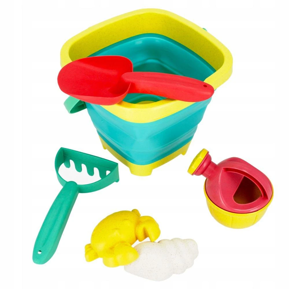 Obsah sady: skládací kyblík, konička, hrábě, lopatka, 2x formička.