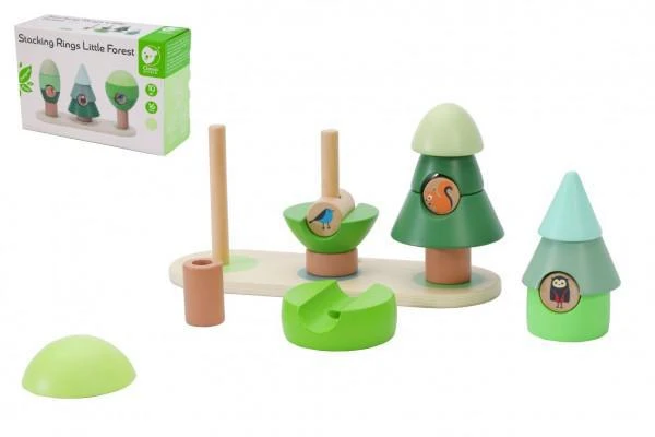 Sada obsahuje tři stromy, ve kterých žijí zvířátka - sova, datel a veverka. Děti mohou dílky stohovat na sebe a vytvářet tak různé tvary. Balení obsahuje 16 dřevěných dílků.Rozměr krabičky: 24 x 16 x 8,5 cm.