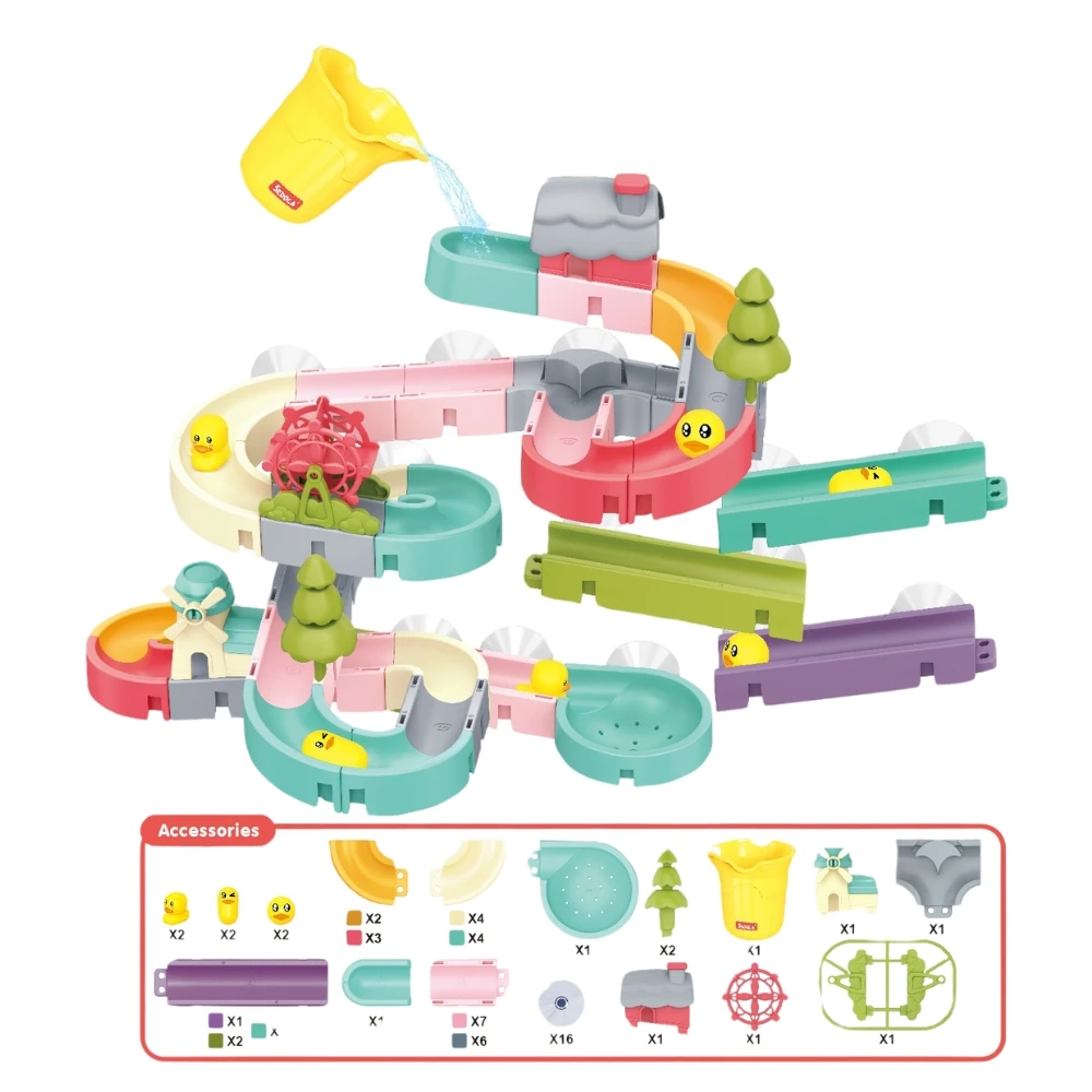Balíček obsahuje míčky, kachny a řadu doplňků, jako je vodní mlýn, vodní kolo, stromy a dům, které slouží jako překážky pro vodu a výrazně obohacují herní zážitek. Děti mohou řídit tok vody, měnit její směr a sledovat, jak jednotlivé prvky ovlivňují pohyb po stezce.