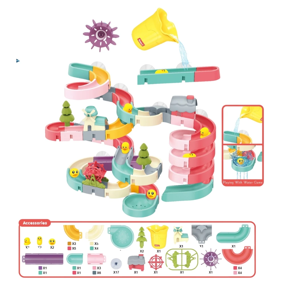 Balíček obsahuje míče, kachny, nádobu na vodu a řadu doplňků, jako je vodní mlýn, vodní kolo, stromy a dům, které slouží jako překážky pro vodu a výrazně obohacují herní zážitek. Děti mohou řídit tok vody, měnit její směr a sledovat, jak jednotlivé prvky ovlivňují pohyb po stezce.