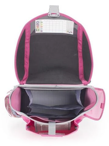 Vnitřní část školní aktovky je členěna variabilní všitou přepážkou na tři části. Tím je zajištěna větší efektivita pro vnitřní uspořádání jednotlivých školních pomůcek (sešitů, knih apod.) podle individuální potřeby žáka. Na předním dílu je našita dále velká kapsa rozměrů š.215 x h.50 x v.270mm. Její horní část kapsy se uzavírá pomocí popruhu se suchým zipem. Uvnitř kapsy je našita síťovaná kapsička na zip. Přes celou šířku přední kapsy jsou našity dva bezpečnostní reflexní pásky, dále pak potom i přes obě boční kapsy jeden a stejně tak na nosných řemenech. Aktovka je uzavřena prostorově tvarovanou klopnou přes celý svůj obvod, včetně přední kapsy. Tím je chráněn obsah aktovky před znehodnocením při deštivém počasí. Na vnitřní straně klopny je rozvrh hodin. Použité vnější textilní materiály (převážně PES) jsou opatřeny na povrchu vodoodpudivou impregnací. Klopna je zajištěna proti otevření kovovým aktovkovým zámkem s reflexní odrazkou. Zámek díky svému uchycení, lze jednoduše otevřít jednou rukou. Zadní část aktovky tvoří nově vyvinuté ergonomické polstrování ze speciální síťoviny s vetkanou PU pěnou, která zajišťuje optimální cirkulaci vzduchu v zádové části. Oba tyto faktory přispívají nejen k pohodlnému nošení aktovky, ale také zajišťují správné zatížení a vývoj páteřního systému. V horní části zádové části se ještě nachází textilní poutko pro zavěšení aktovky na lavici a ergonomické držadlo. Dolní část batohu je opatřena jednolitým plastovým dnem, které umožňuje dlouhodobé stání aktovky na mokré podložce, aniž by hrozilo znehodnocení jejího obsahu. Korpus aktovky je na každém boku osazen prostornou boční kapsou. Se síťovinou je určena na lahev s pitíčkem a s klopničkou na penál nebo svačinu.