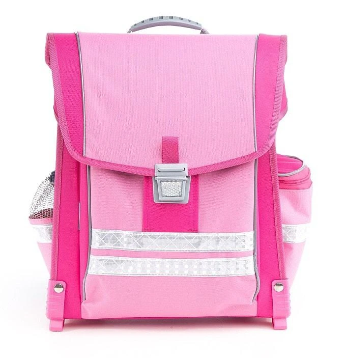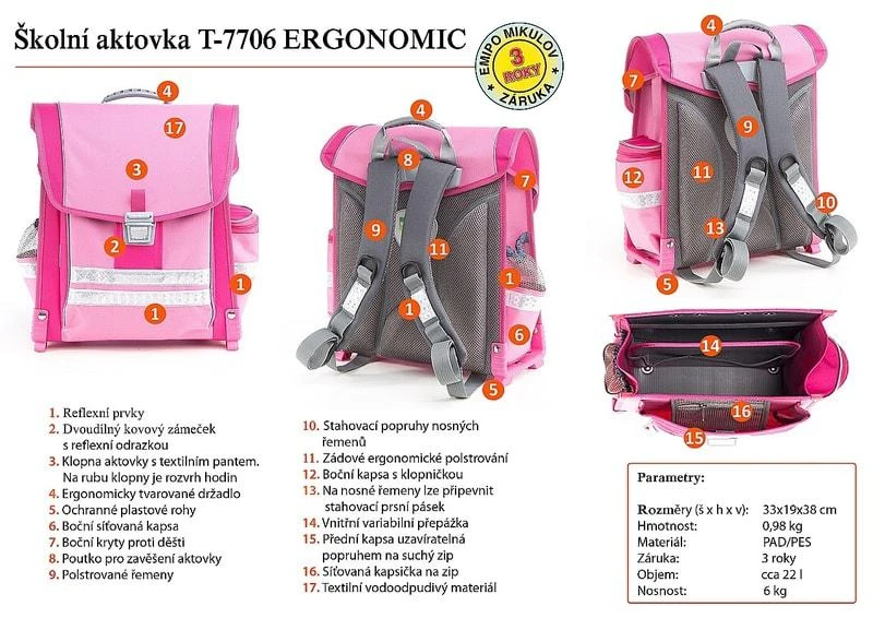 Vnitřní část tvoří jedna velká komora, která je rozčleněna pohyblivou přepážkou na dvě části. Přepážka zajišťuje větší variabilitu pro vnitřní uspořádání jednotlivých školních pomůcek podle individuální potřeby žáka. Na této přepážce jsou našita dvě větší gumová poutka. Jedno velké je i v zadní části. Na předním dílu je našita větší otevřená kapsa uzavíratelná poutkem na suchý zip. V horní části je přišita síťovaná kapsička na drobné věci. Aktovku uzavírá klopna upevněná na zadním dílu přes textilní pant. Ten umožňuje po otevření zůstat klopně v zadní poloze. Klopna zakrývá celou hlavní komoru včetně přední kapsy tak, aby se za deště do těchto prostor nedostala žádná vlhkost. Tomu napomáhá i vodoodpudivá úpravy použitých textilií. Na vnitřní straně klopny je týdenní rozvrh hodin se jmenovkou. Klopna je zajištěna proti otevření zámkem s reflexní odrazkou (reflektorem). Zámek jde jednoduše otevřít jednou rukou, když pod něj zasuneme dva prsty a palcem zatlačíme na reflektor s následným pohybem směrem nahoru. Zádová část má ergonomické polstrování. Jeho tvar a tuhost jsou nastaveny tak, aby se neprotláčel obsah aktovky do zad školáka a aby držel správnou polohu páteře, tzv. aby seděl dobře na zádech. Zádový díl a nosné dno jsou pevně spojeny, takže batoh drží tvar i při plném zatížení. Široké polstrované řemeny umožňují pohodlné nošení i velkého objemu školních pomůcek. V horní části mezi řemeny je všité poutko na zavěšení batohu na lavici a držadlo pro nesení batohu v ruce. Jejich určení nezaměňovat! Na bocích jsou kapsy. Z části síťovaná má v horní části všitou gumu a je určena pro uložení lahve na pití. Druhá na zip je určena pro další drobné školní pomůcky. Reflexní prvky jsou jak na předním dílu, tak na nosných řemenech a i po obou stranách na bočních kapsách. Dolní část batohu je opatřena ochrannými plastovými rohy, které mimo jiného, umožňují dlouhodobé stání aktovky na mokré podložce, aniž by hrozilo znehodnocení jejího obsahu. Společnost EMIPO, která tuto aktovku vyrábí, Vám nabízí extra lehký výrobek s pevnou konstrukcí, tříletou zárukou a doživotně bezplatným servisem.