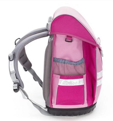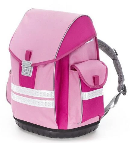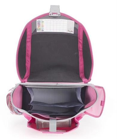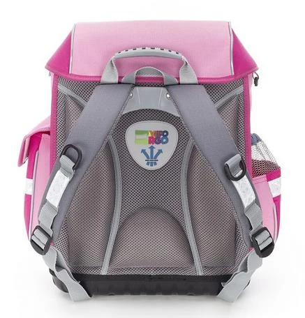 Vnitřní část školní aktovky je členěna variabilní všitou přepážkou na tři části. Tím je zajištěna větší efektivita pro vnitřní uspořádání jednotlivých školních pomůcek (sešitů, knih apod.) podle individuální potřeby žáka. Na předním dílu je našita dále velká kapsa rozměru š.215 x h.50 x v.270mm. Její horní část se uzavírá pomocí popruhu se suchým zipem. Přes celou šířku přední kapsy jsou našity dva bezpečnostní reflexní pásky, dále pak potom i přes obě boční kapsy jeden a stejně tak na nosných řemenech. Aktovka je uzavřena prostorově tvarovanou klopnou přes celý svůj obvod, včetně přední kapsy. Tím je chráněn obsah aktovky před znehodnocením při deštivém počasí. Klopna je zajištěna proti otevření kovovým zámečkem s reflexní odrazkou. Zámek díky svému uchycení, lze jednoduše otevřít jednou rukou. Zadní část aktovky je opatřena nově vyvinutým ergonomickým polstrováním ze speciální síťoviny s vetkanou PU pěnou, která zajišťuje optimální cirkulaci vzduchu v zádové části. Oba tyto faktory přispívají nejen k pohodlnému nošení aktovky, ale také zajišťují správné zatížení a vývoj páteřního systému. Dolní část batohu je opatřena jednolitým plastovým dnem, které umožňuje dlouhodobé stání aktovky na mokré podložce, aniž by hrozilo znehodnocení jejího obsahu. Korpus aktovky je na každém boku osazen prostornou boční kapsou. Se síťovinou je určena na lahev s pitíčkem a s klopničkou na penál nebo svačinu. Při celkových rozměrech š.370 (včetně kapes) x h.230 x v.395mm váží batoh jen pouhých 0,95kg! Naše společnost Vám nabízí extra lehkou kvalitní školní aktovku s pevnou konstrukcí, tříletou zárukou a doživotně bezplatným servisem !