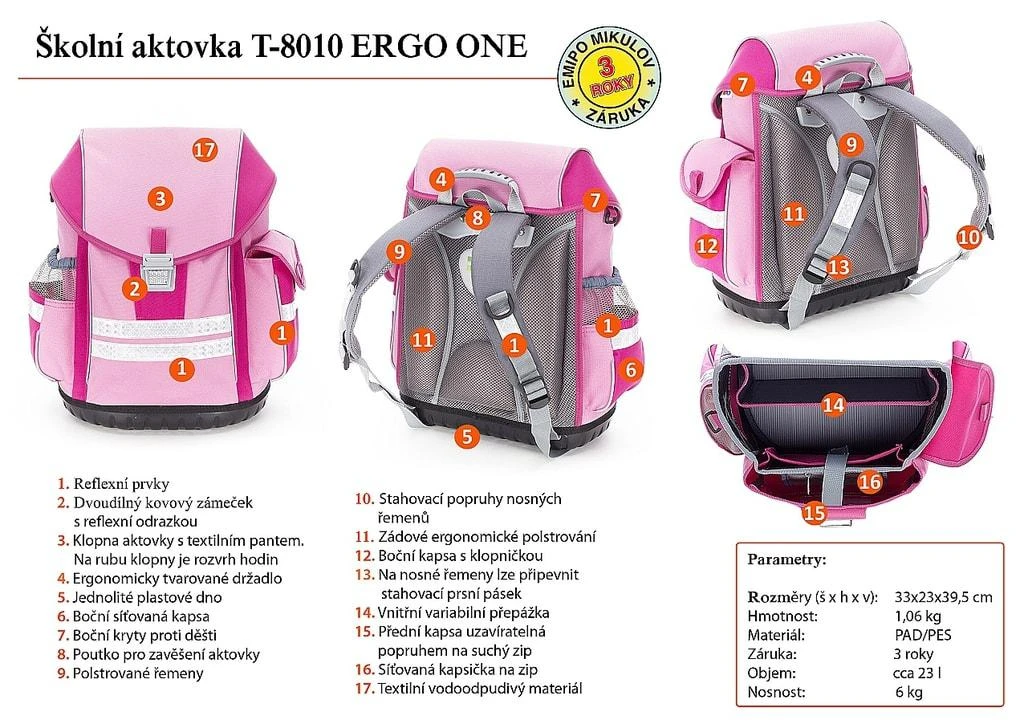 Školní aktovka ERGO ONE je konstrukčně nového typu vycházející z dlouhodobých zkušeností firmy EMIPO s jejich výrobou. Je určena pro začínající školáky a je vyráběna v souladu s ČSN 796506. Vyznačuje se pevnou konstrukcí, použitím odlehčených materiálů, bohatým vnitřním členěním, max. použitím bezpečnostních prvků, novým ergonomickým polstrováním zádové části a nosných řemenů, moderním designem.