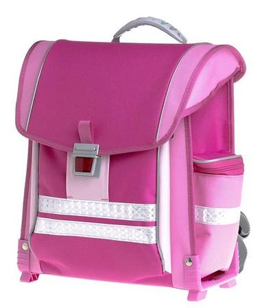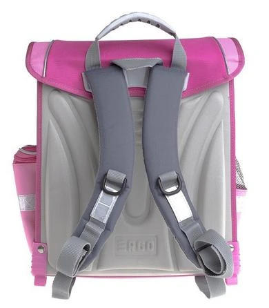 Vnitřní část školní aktovky je členěna pohyblivou přepážkou na dvě části. Její plynule měnitelnou polohu umožňuje šlová pruženka. Tím je zajištěna větší variabilita pro vnitřní uspořádání jednotlivých školních pomůcek (sešitů, knih apod.) podle individuální potřeby žáka. Na této přepážce jsou také vytvořeny pružné úchyty pro upevnění např. sešitů formátu A5, žákovské knížky, hygienických kapesníčků, mobilního telefonu apod. Na předním dílu je našita plastová kapsička s týdenním rozvrhem hodin a jmenovkou a dále velká kapsa rozměru š.230 x h.50 x v.270mm. Její horní část se uzavírá pomocí popruhu se suchým zipem. Přes celou šířku přední kapsy jsou našity dva bezpečnostní reflexní pásky a přes obě boční kapsy jeden. Školní batoh je uzavřen prostorově tvarovanou klopnou přes celý svůj obvod, včetně přední kapsy. Tím je chráněn obsah aktovky před znehodnocením při deštivém počasí. Klopna je zajištěna proti otevření kovovým zámečkem s reflexní odrazkou. Zadní část batohu je opatřena nově vyvinutými anatomicky tvarovanými zády ERGO vyrobenými z gumové pěny na povrchu potažené bavlněnou textilií. Jejich tuhost je nastavena tak, aby se jednak neprotláčel obsah batohu do zad školáka a také aby tzv. seděla na zádech a držela správnou polohu páteře. Dolní část batohu je opatřena ochrannými plastovými rohy, které mimo jiného, umožňují dlouhodobé stání aktovky na mokré podložce, aniž by hrozilo znehodnocení jejího obsahu. Při celkových rozměrech š.320 x h.140 x v.390mm váží batoh pouhých 0,98kg! Naše společnost Vám nabízí extra lehkou školní aktovku s pevnou konstrukcí a tříletou zárukou a doživotně bezplatným servisem !