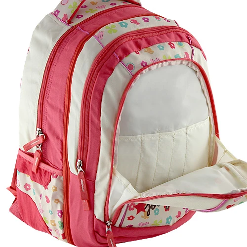 V horní části měkké poutko do ruky přizpůsobené dětské ruce. Tento mimořádně praktický batoh nabízí tři prostorné komory a přední kapsu s jednoduchým organizérem, vše uzavíratelné na zip. Dvě postranní polosíťované kapsy na láhev s pitím.