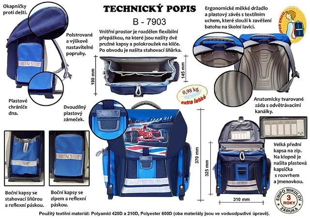 Klopna je přes celý svůj obvod, včetně přední kapsy. Tím je chráněn obsah před znehodnocením při deštivém počasí. Na vnitřní části klopny je našita plastová kapsička s týdenním rozvrhem hodin a jmenovkou. Zadní část batohu je opatřena anatomicky tvarovanými zády vyrobenými z gumové pěny na povrchu potažené bavlněnou textilií. Jejich tuhost je nastavena tak, aby se jednak neprotláčel obsah batohu do zad školáka a také aby tzv. seděla na zádech a držela správnou polohu páteře. Dolní část batohu je opatřena ochrannými plastovými rohy, které mimo jiného, umožňují dlouhodobé stání aktovky na mokré podložce, aniž by hrozilo znehodnocení jejího obsahu.