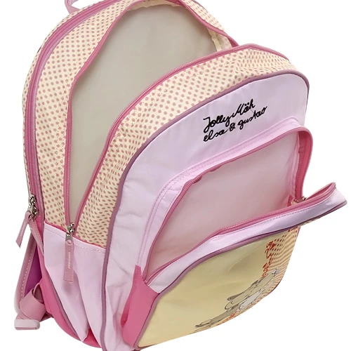 Batoh disponuje voděodolným povrchem a dvěma oddělenými komorami pro přehledné uložení školních pomůcek. Přední prostorná zipová kapsa na svačinu či drobnější věci. Po obou stranách batohu kapsy na láhev s pitím.