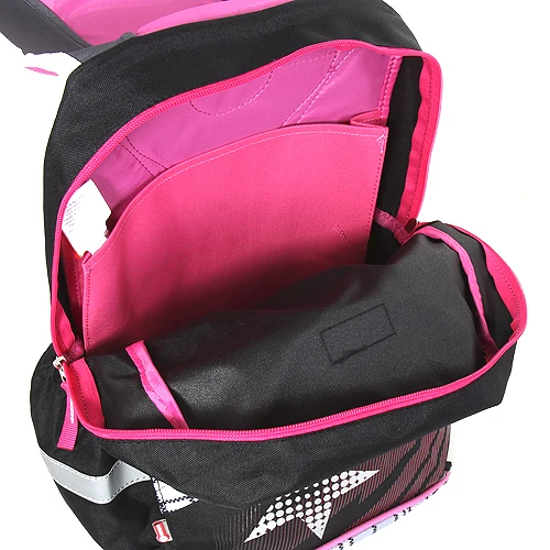 Batoh disponuje hlavní komorou opatřenou zipem, kde vnitřní prostor je oddělen přepážkou a menší vnitřní kapsou. Přední vnější kapsa na svačinu, po obou stranách batohu kapsy na láhev s pitím. Dno batohu je vyrobeno z pevného materiálu, díky němuž nedochází k jeho prohýbání či převržení. Reflexní prvky zajistí bezpečnost dětí za zhoršených světelných podmínek. V horní části poutko do ruky či zavěšení.