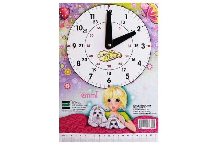Školní hodiny slouží k výuce času prvňáčkům základních škol. Ve spodní části hodin je pravítko, které se může odstřihnout a používat samostatně.