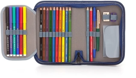 Plněný školní jednopatrový penál s klopou obsahuje: