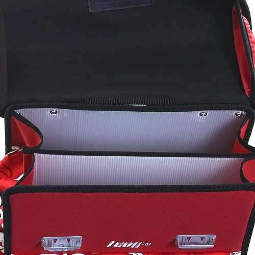 Dvě venkovní kapsy na drobnější předměty a boční síťovaná kapsa na láhev s pitím. V horní části držátko speciálně tvarované pro malou dětskou ruku. Pevné dno zpevněné na bočních stranách, chrání aktovku před mechanickým poškozením a proti vniknutí vody.