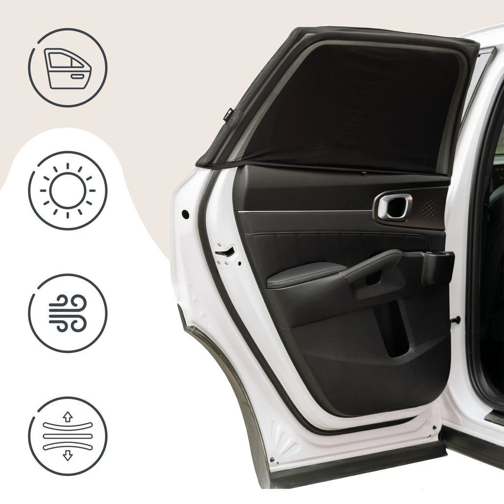 Praktická sada dvou síťových slunečních clon určených k zatemnění zadních bočních oken automobilu. Produkt byl vytvořen s ohledem na pohodlí dětí cestujících na zadních sedadlech a je vyroben z lehkého, ale odolného polyesterového materiálu. Účinně blokuje sluneční světlo tím, že zakrývá celou plochu okna, čímž snižuje hromadění tepla v interiéru a zvyšuje tepelný komfort v horkých dnech. Síťovina nejen chrání před slunečním zářením, ale také zvyšuje soukromí v automobilu, což je zvláště užitečné při činnostech, jako je kojení.