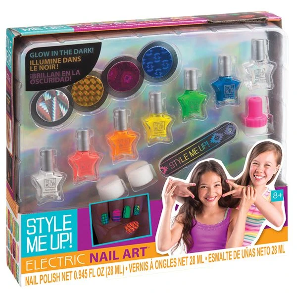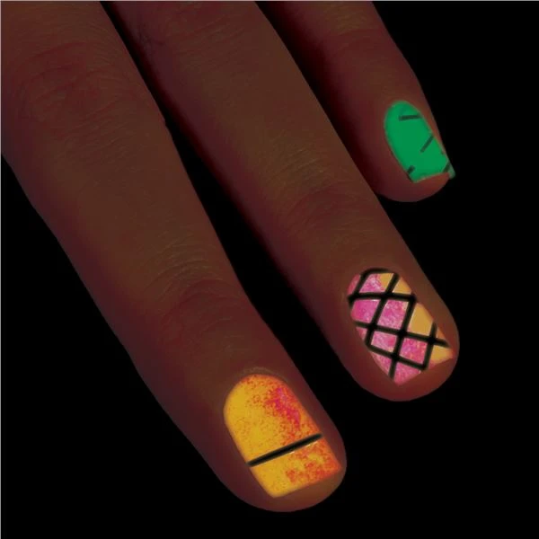Style me up! S touto velkou sadou se budeš cítit jako v salonu krásy! Nalakuj si nehty lakem na nehty, který svítí ve tmě a ozdob si je dle své vlastní fantazie. Balení obsahuje 4 válečky lepící pásky, 1 houbový aplikátor, 3 houbičky, 2 normální laky, 5 laků zářicích ve tmě, 1 pilníček na nehty a návod.