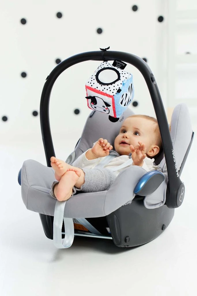 Dvě strany kostky mají vyčnívající prvky zvířátek – kravské uši, tygří ocas – dítě se učí různé textury materiálů, může uchopit vyčnívající prvky a procvičovat si tak jemnou motoriku. Na další plyšové straně je kapsička s plyšovým míčkem na provázku – prvek vybízí děti k uchopení míčku a jeho vkládání a vyjímání z kapsy – to podporuje tzv. jemné motorické dovednosti a učení motorické koordinace. Na další z plyšových stran je zrcátko, které přitahuje pozornost miminka, vybízí ho, aby kostku uchopil a dozvěděl se o svém odrazu. Z druhé strany jsou našity další stuhy, které zároveň stimulují jemnou motoriku.