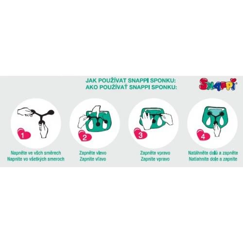 Snappi je velmi praktická, snadno se používá, a nemusíte se bát, že s ní miminku ublížíte. Jde o sponku ve tvaru T. Na koncích je opatřena malými zoubky, které se zachytí za látku.