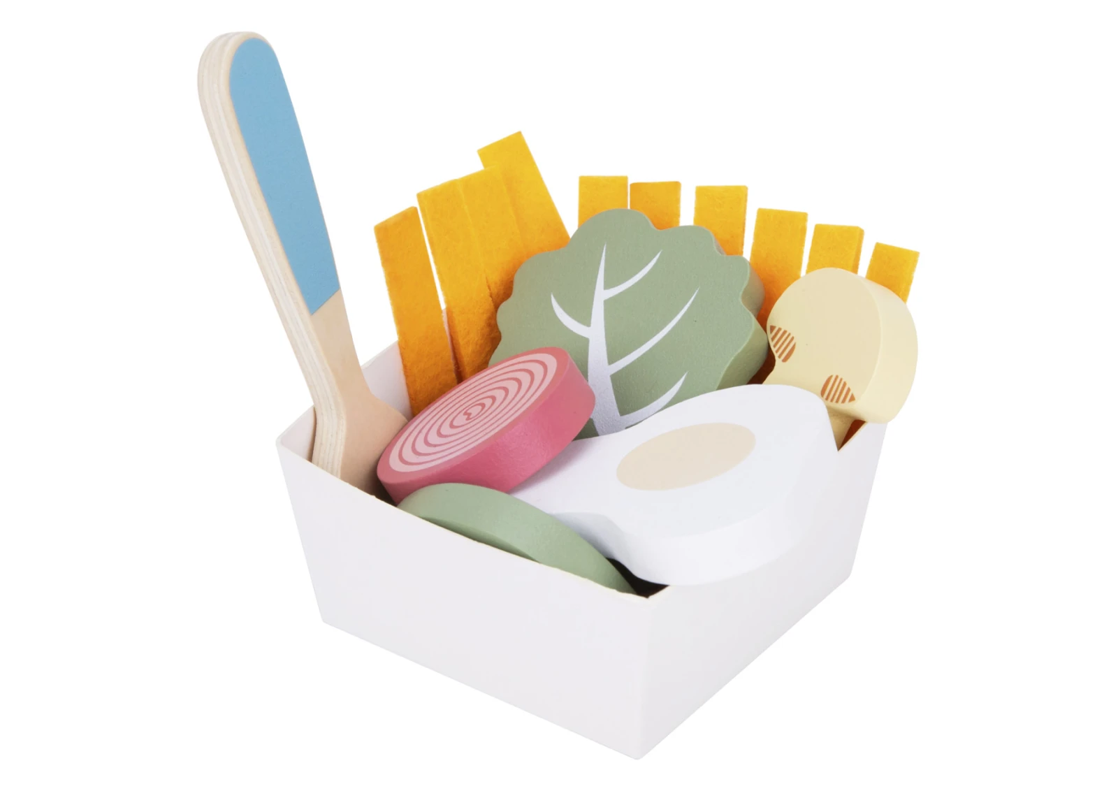Sada obsahuje 25 kusů dřevěných potravin a doplňků nejen pro zdravou snídani, ale také pro nekonečnou představivou hru. Součástí je také příbor a miska, což zvyšuje realistický dojem. Díky dvěma rukojetím je tác snadno přenosný.