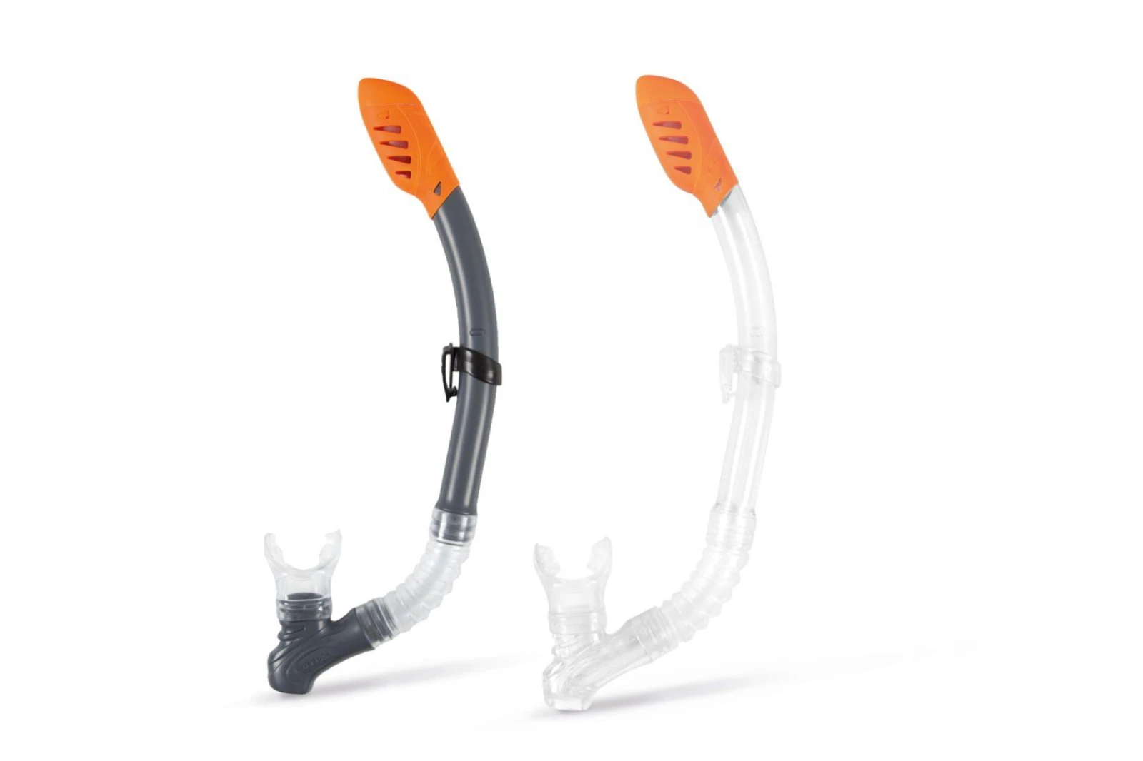 Dvojité zahnutí šnorchlu zaručuje lepší přilnutí k tváři. Obsahuje i sponu k připevnění k masce a zpětný ventil.
